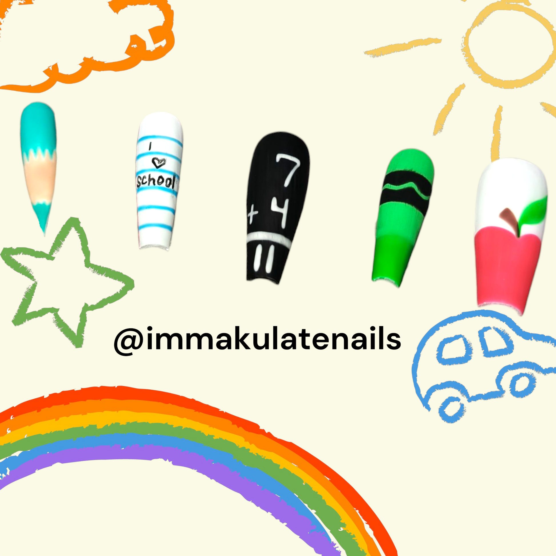 Get ready to go back to school with these school themed nails! Perfect for teachers or students, these nails will make a statement in the classroom. Show off your unique style and add some fun to your back to school look. Say goodbye to boring nails and hello to our quirky and playful set!