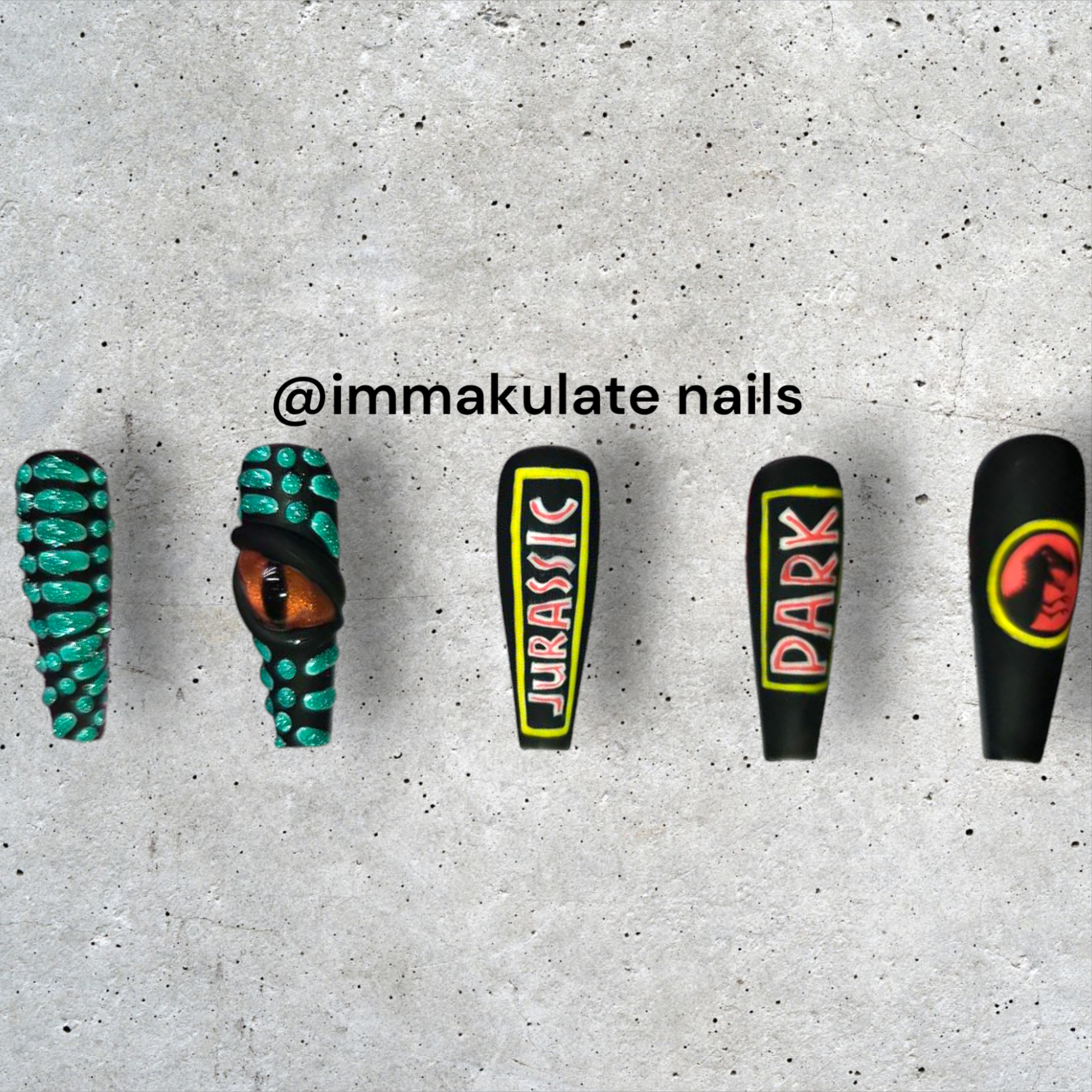 Step into a prehistoric adventure with this Jurassic Park nail set featuring a striking 3D dinosaur eye. Each nail captures the wild spirit of the Jurassic era, adding a fun and fierce touch to your look. Perfect for dino lovers ready to make a bold, playful statement!